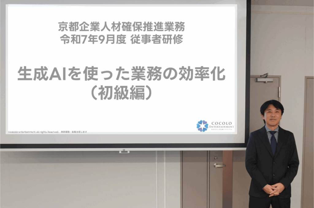 京都ジョブパーク主催で、「生成AIを使った業務の効率化(初級編)」 2025 9/27 研修&セミナー 2025年9月27日 京都ジョブパーク・京都企業人材確保センター様主催で、「生成AIを使った業務の効率化(初級編)」 をテーマに、京都ジョブパークにお勤めの全職員の皆さまを対象とした2時間の研修を担当させていただきました。 WEBと対面のハイブリッド形式で、約80名の方々にご参加いただきました。 登壇後には「今までの研修で一番楽しかった!」とのお声もいただき、嬉しかったです。 ご参加くださった皆さま、ありがとうございました。20250929 最新情報は、LINE・メルマガで優先配信します 研修&セミナー