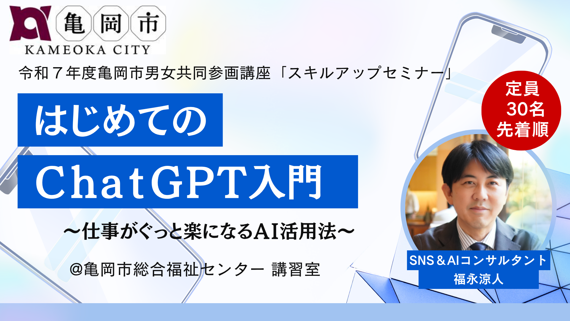10/25【亀岡市男女共同参画センター主催】はじめてのChatGPT入門~仕事がぐっと楽になるAI活用法~ 2025 10/06 お知らせ 研修&セミナー 2025年10月6日 詳細はこちら 最新情報は、LINE・メルマガで優先配信します お知らせ 研修&セミナー